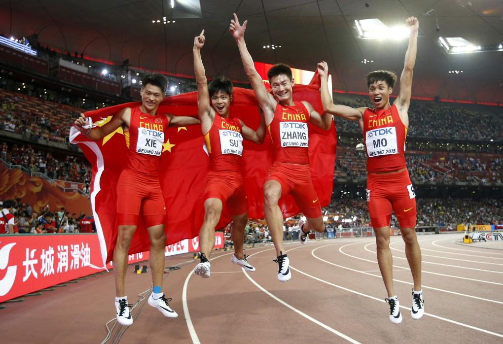 2015年8月29日,在北京田径世锦赛男子4X100米接力决赛后,中国队选手谢震业、苏炳添、张培萌和莫有雪(从左至右)庆祝获得银牌。新华社记者王丽莉摄
