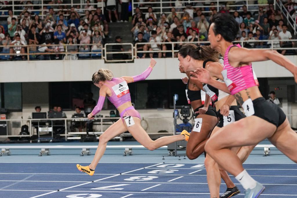 9月7日,2025年世界田联洲际巡回赛(金标)北京站女子100米栏比赛,匈牙利选手安娜·托特(左一)在比赛中冲线。新华社记者 鞠焕宗 摄