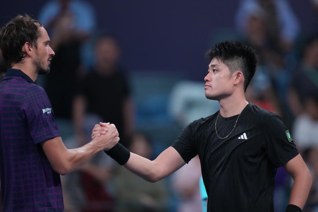 9月21日,吴易昺(右)获胜后与梅德韦杰夫握手致意。新华社记者 黄宗治 摄