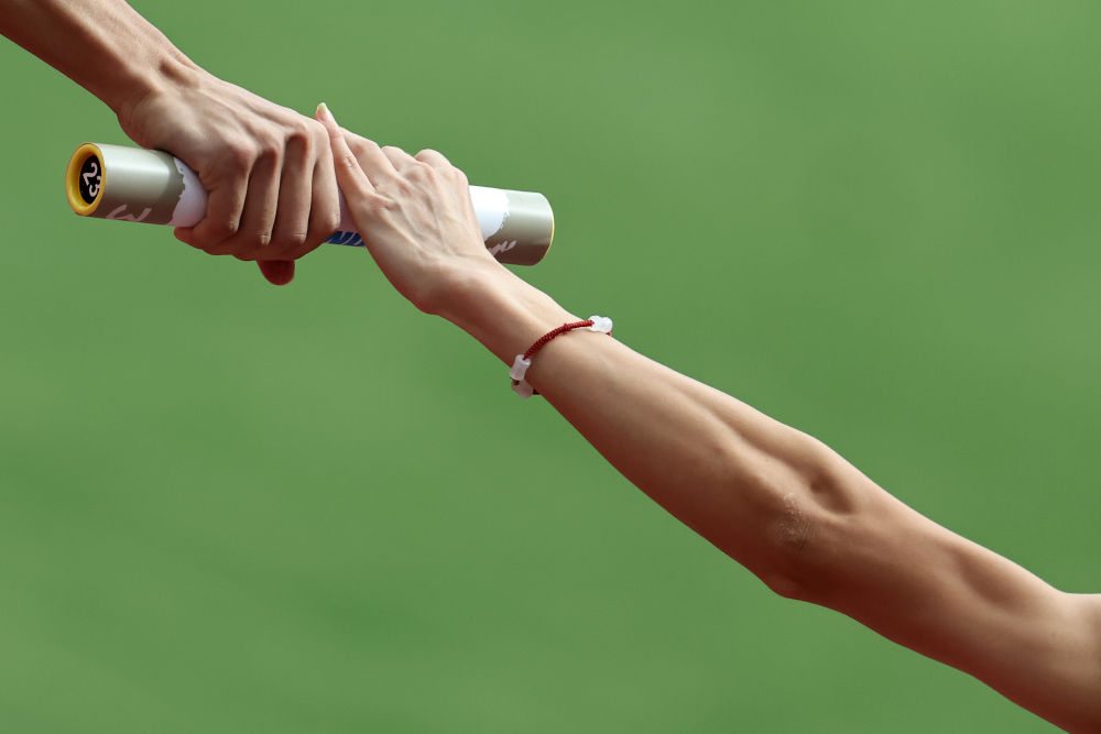 9月13日,中国队在混合4X400米接力预赛中交接棒。新华社记者 贾浩成 摄